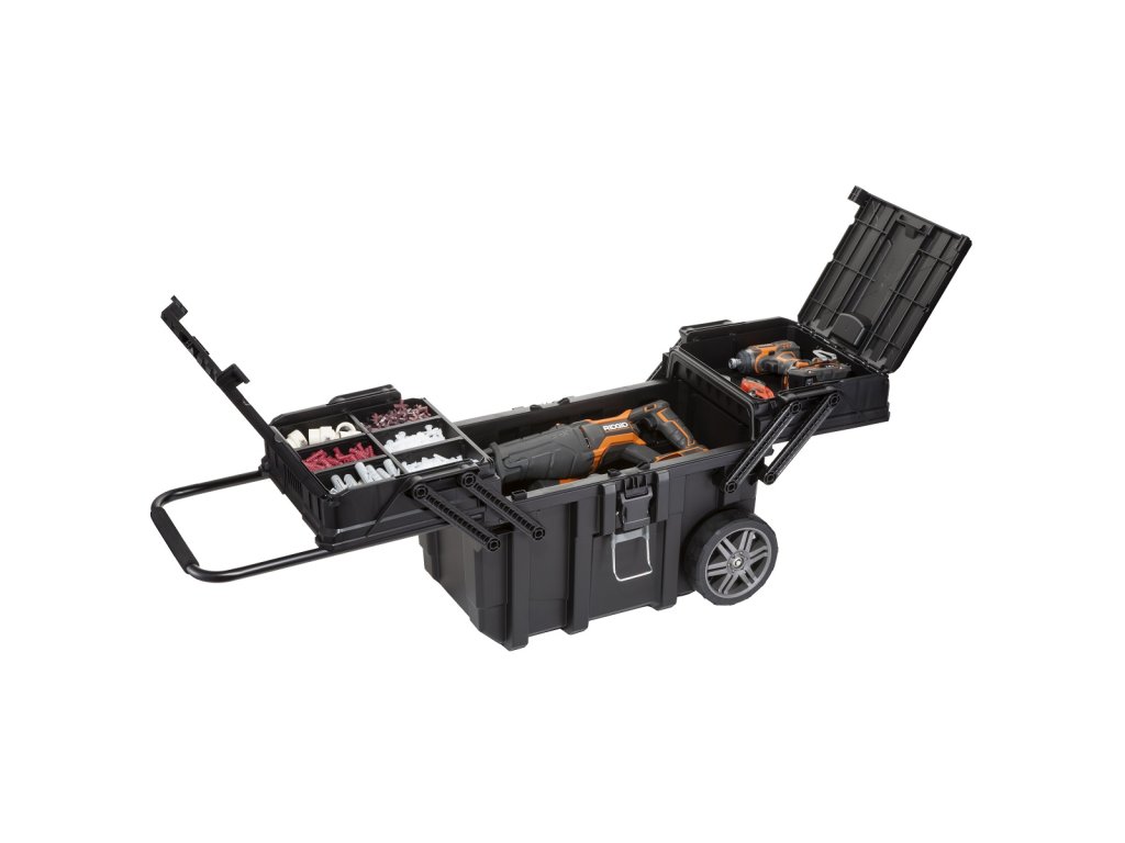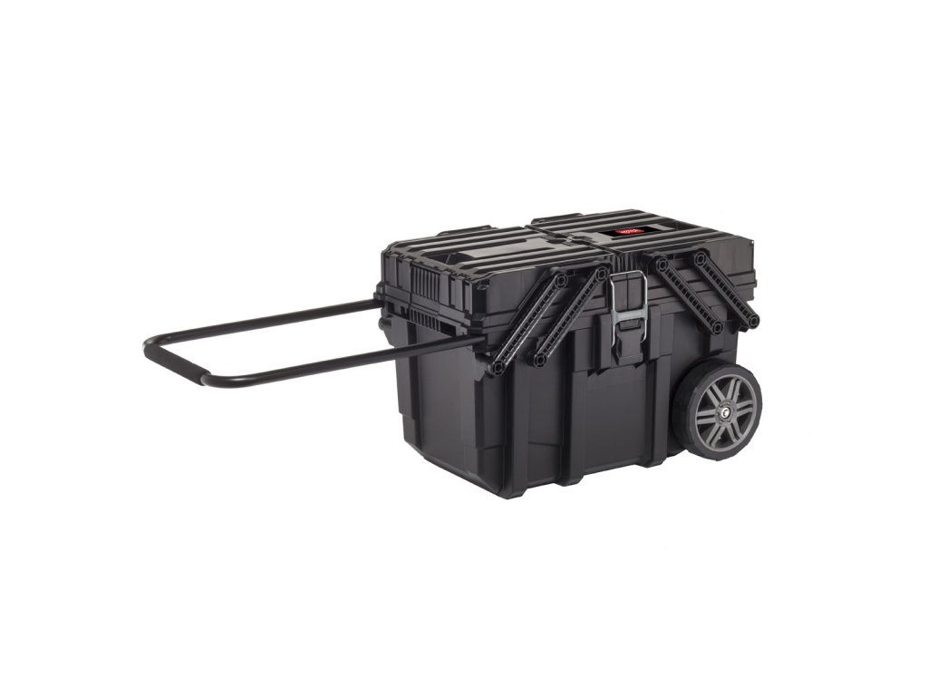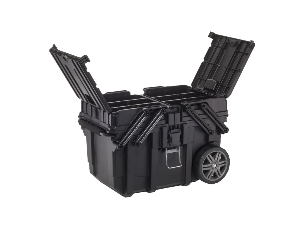 Box nabízí velmi prostorný hlavní prostor - ideální pro větší nástroje - a dva zásobníky umístěné na posuvné horní úrovni. Zásobníky jsou jedna menší přihrádka pro malé nářadí a jedna přihrádka se 6 přihrádkami pro malé upevňovací prvky. Celek díky speciální zatahovací konstrukci umožňuje snadný a pohodlný přístup ke všem uloženým nástrojům a prvkům současně. Profesionálové také ocení kovové západky, prostor visacího zámku a pevné zámky, stejně jako systém centrálního zamykání, který udržuje obsah ve stabilní poloze, stejně jako držáky podporující stabilitu krabice po rozložení. Další výhodou boxu je teleskopická rukojeť s měkkou rukojetí a 7 " gumovými koly pro rychlý transport.