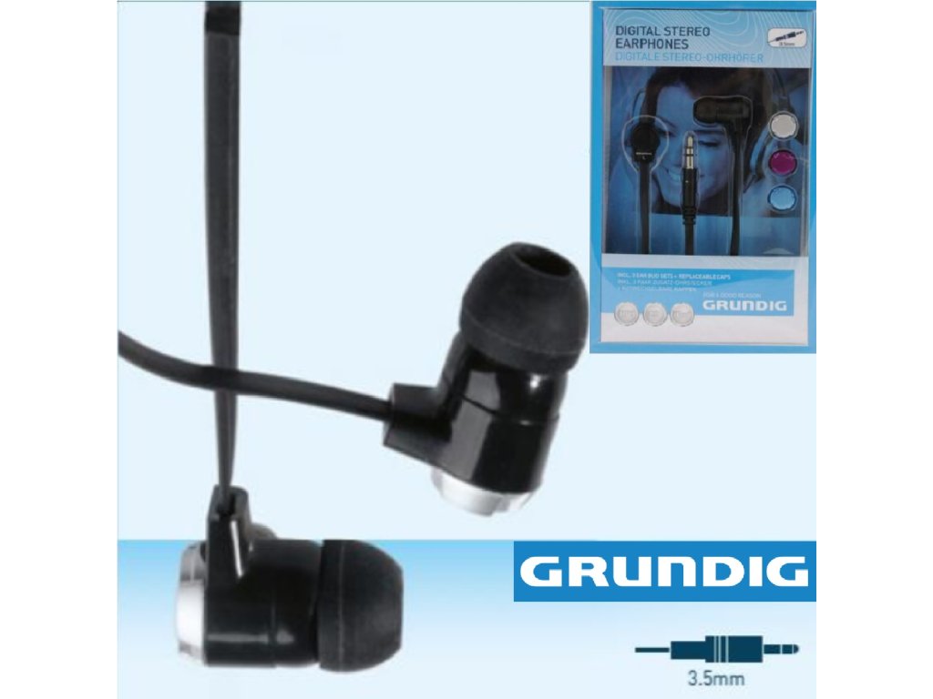 Sluchátka - špunty do uší. Sluchátka firmy Grundig pro poslouchání hudby a zvukových záznamů na přenosných zařízeních. Vyrábí GRUNDIG.