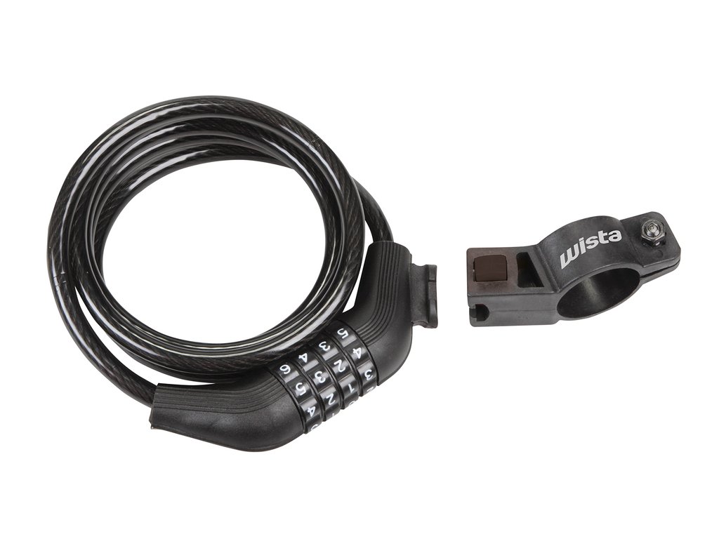 Zámek na kolo WISTA se stupněm zabezpečení 3, délkou 150 cm, průměrem 8 mm a odemykáním pomocí 4 místného kódu, pro bezpečné parkování vašeho kola. Dostatečná délka lanka zajistí, že můžete proplést zámek přes víc částí kola. Zámek je dodáván včetně držáku na sedlovku. Technický popis: bezpečnostní zámek na kolo rozměr 1500×8 mm stupeň zabezpečení 3 včetně držáku na sedlovku 4 místný číselný kód možnost nastavení vlastního kódu