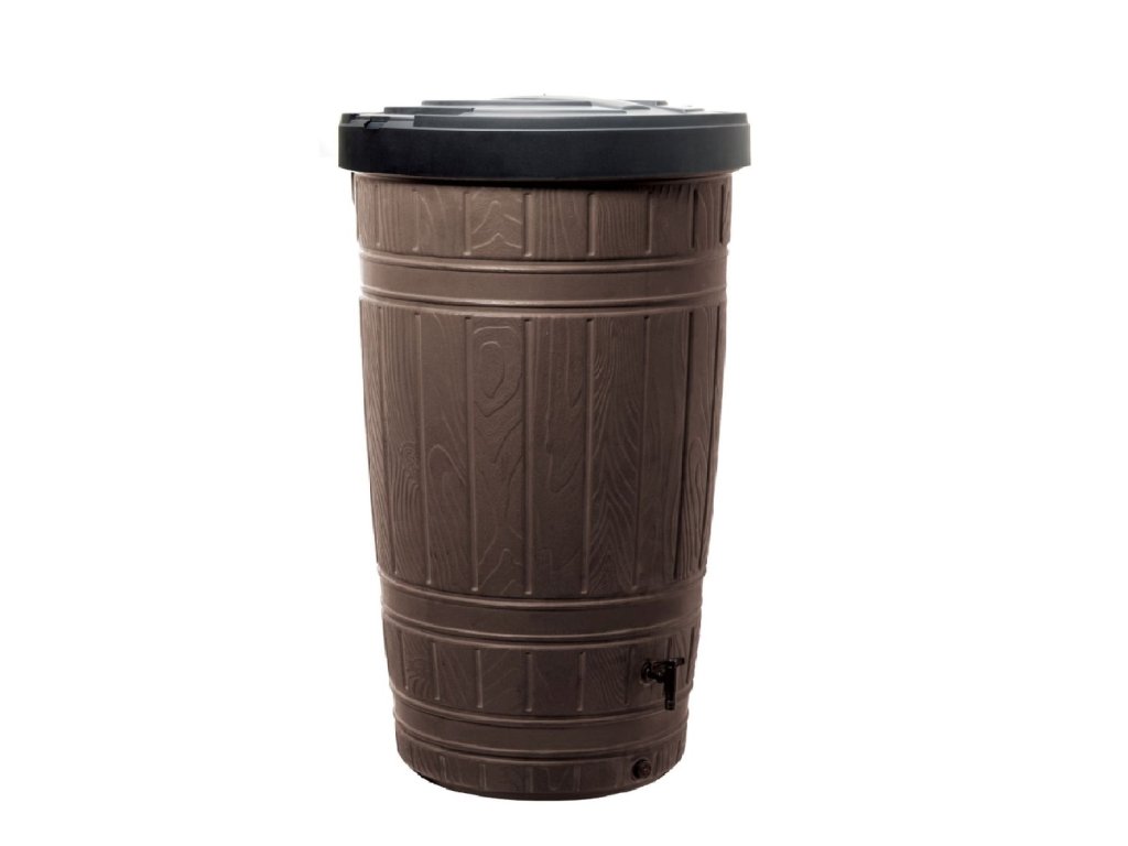 Plastový barel s imitací dřeva jako na dřevěném sudu. Barel je vhodný pro shromažďování a uchovávání dešťové vody pro zalévání vody. Součástí je černé víko. Objem: 265 l. Šířka: 66 cm, výška: 111 cm, hmotnost: 7,2 kg.