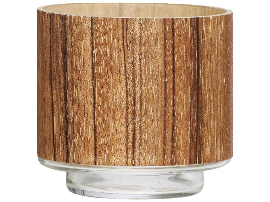 Zajímavý svícen v dekoru dřeva o průměru 7 cm je vhodný pro standardní čajové svíčky. Jeho výška je 7,5 cm