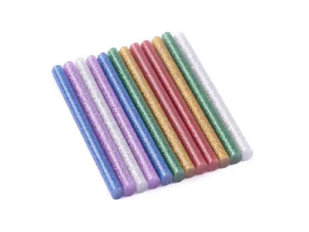 průměr: 7mm délka: 100mm množství: 12ks s glitry - teplota tavení 83-176C - doba tuhnutí 30-40 s - použití : na plasty, papír, dřevo - 2ks stříbrné, 2ks zlaté, 2ks červené - 2ks fialové, 2ks modré, 2ks zelené