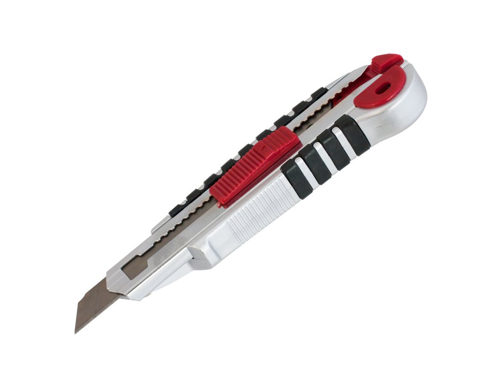 Tento nůž má zesílené vodící kovové lišty a má ergonomický tvar doplněný protiskluzovým TPR materiálem. V zásobníku nože jsou uloženy náhradní čepele. V sadě je dodáván nůž s 5 ulamovacími čepelemi. Nůž je vybaven mechanizmem pro automatické doplňování nových čepelí ze zásobníku. Po vysunutí staré čepele dopředu a její vyndání postačí pouze posuvným tlačítkem zajet zpět do zadu a nová čepel se doplní ze zásobníku k dalšímu použití. Vysunutou čepel je možné aretovat pomocným šroubem proti nechtěnému posuvu. Zásobník je možné doplňovat standardními ulamovacími čepelemi šíře 18mm. Zásobník vysunete směrem dozadu za červený výstupek na konci kovového vedení. POZOR zásobník je blokovaný pojistkou ve formě červeného půlkruhu s otvorem - tuto pojistku je nutné vysunout do strany a uvolnit tak zásobník. Po doplnění čepelí a zpětném zasunutí zásobníku vraťte pojistku zpět.