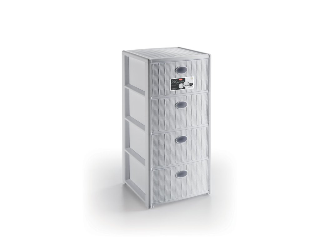 Praktická úložná skříňka s čtyřmi zásuvkami, ideální pro uspořádání drobností v domácnosti, koupelně nebo kanceláři. Díky štíhlému a kompaktnímu designu se hodí i do užších prostor. Je vyrobena z odolného plastu se strukturovaným povrchem v elegantním stylu kolekce Elegance. Zásuvky se hladce vysouvají a nabízejí dostatek úložného prostoru pro hygienické potřeby, kancelářské pomůcky nebo další drobné předměty. Skříňka je lehká, stabilní a snadno udržovatelná.