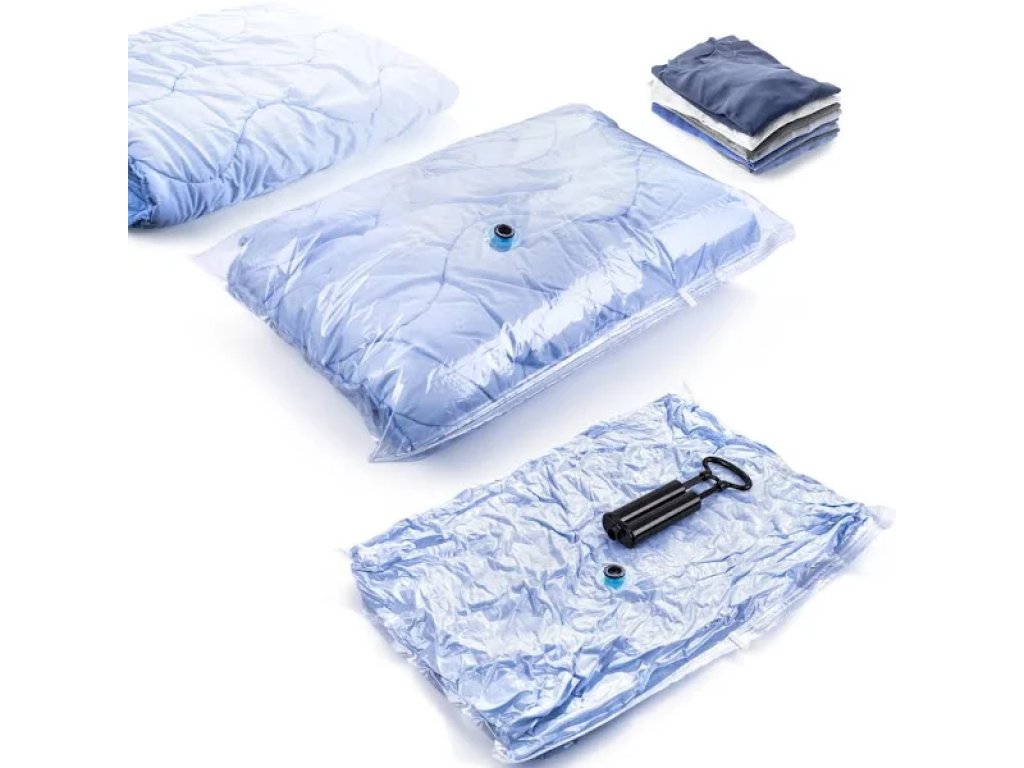 Sada 2ks úložných vaků 45 x 70 cm + pumpička VACUUM. Úložný vak slouží jako ideální ochrana oděvů nebo textílie proti prachu, molům, vlhkosti nebo zápachu. Vak je antibakteriální a obsahuje vzduchotěsné zavírání a odsávací ventil pro všechny typy běžných vysavačů. Vak má silnou fólii zaručující dlouhou životnost a umožňuje opakované používání. Při skladování ušetříte až 80% místa. Zpětný ventil znemožňuje úniku vzduchu směrem ven.dsávací pumpa vyrobena z plastu. Materiál: PA + PE.