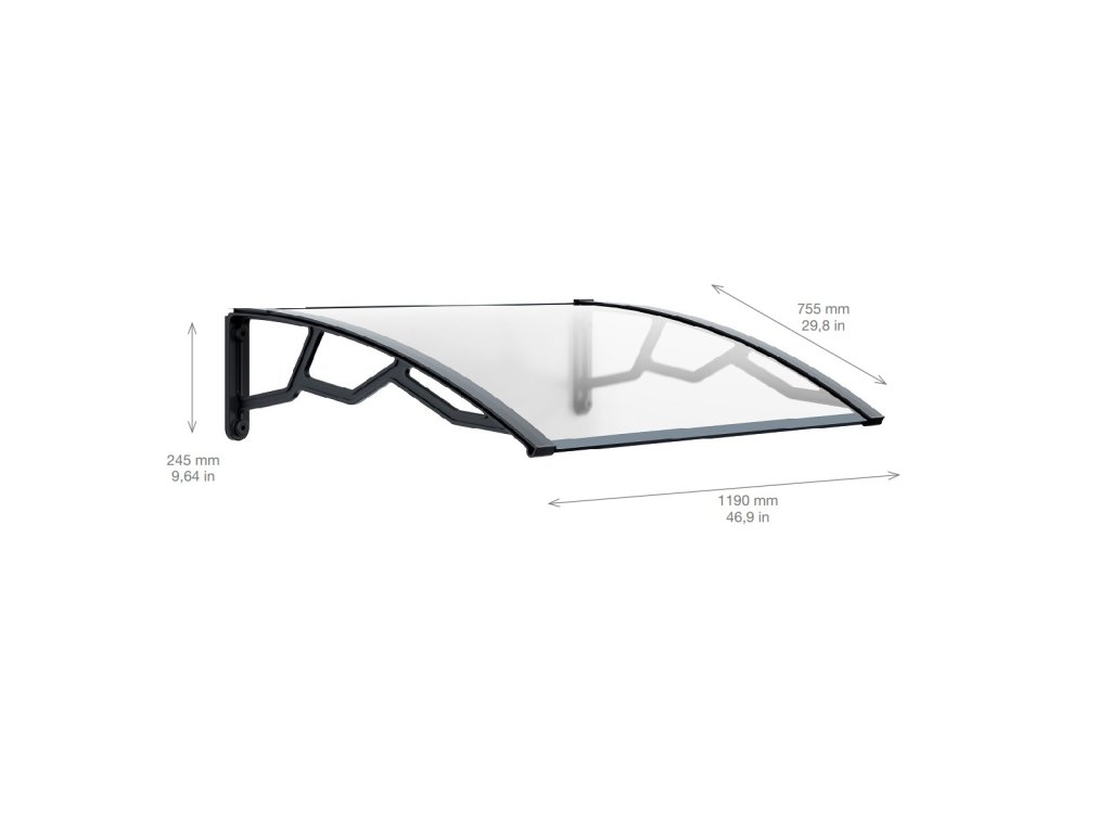 Stříška s kompaktním (plným) polykarbonátem čiré barvy s anti-UV ochranou a tloušťkou 4mm. Nosná ramena / rám zesílený polypropylen v tmavě šedé barvě. Stříška Vám zajistí ochranu před nepříznivým počasím a ochrání vstupní prostor. Možné využít i jako částečné zastřešení balkónů nebo chodníku okolo budovy.