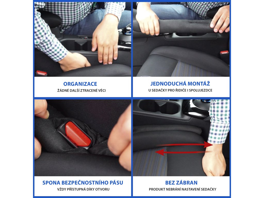 Už nikdy neztratíte předměty v autě Každý řidič zná následující situaci: jedete na důležitou schůzku a chcete rychle dorazit do cíle, ale náhle vám mobilní telefon, peněženka, klíče nebo jiný důležitý předmět sklouzne do mezery mezi sedadlem a středovou konzolou. Abyste se vyhnuli jakémukoli bezpečnostnímu riziku při pokusu o vytažení předmětu bez zastavení vozu, je tu výplň mezery v autě Anti-Drop. Součástí balení jsou dva kusy, jeden pro řidiče a jeden pro spolujezdce. Přesvědčivé vlastnosti Výplň mezi sedadlového prostoru Anti-Drop v černé barvě je neuvěřitelně praktická a hodí se téměř do každého vozu. Výrobek o rozměrech cca 44x7,5 cm je vyroben z měkkého a pružného materiálu a jednoduše se nasadí na přezku bezpečnostního pásu. Díky tomu Anti-Drop zcela vyplní mezeru mezi sedadlem a středovou konzolou, čímž účinně zabrání sklouznutí mobilního telefonu, mincí nebo jiných důležitých předmětů pod sedadlo. Funkce bezpečnostního pásu není použitím výplně mezery Anti-Drop nijak narušena a výrobek lze také rychle odstranit, pokud již není potřeba nebo překáží. Technický popis: Rozměr: 44 x 7,5 x 5 cm Materiál: Syntetická kůže Zabraňuje pád předmětů mezi sedadlo a středovou konzoli automobilu Pasuje do všech automobilů Uzavírá mezeru mezi sedadlem a středovou konzolí Výřez pro sponu bezpečnostního pásu Jednoduchá a snadná montáž