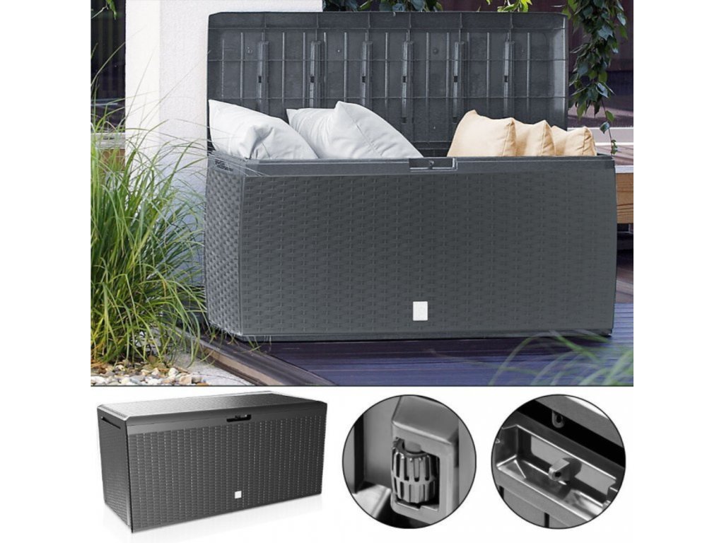 Pro zvýšenou bezpečnost je box vybaven zamykacím systémem, který chrání obsah před nepovolaným přístupem (zámek není součástí balení). Tento praktický a elegantní zahradní box je dokonalým doplňkem pro každou zahradu, terasu nebo balkon.