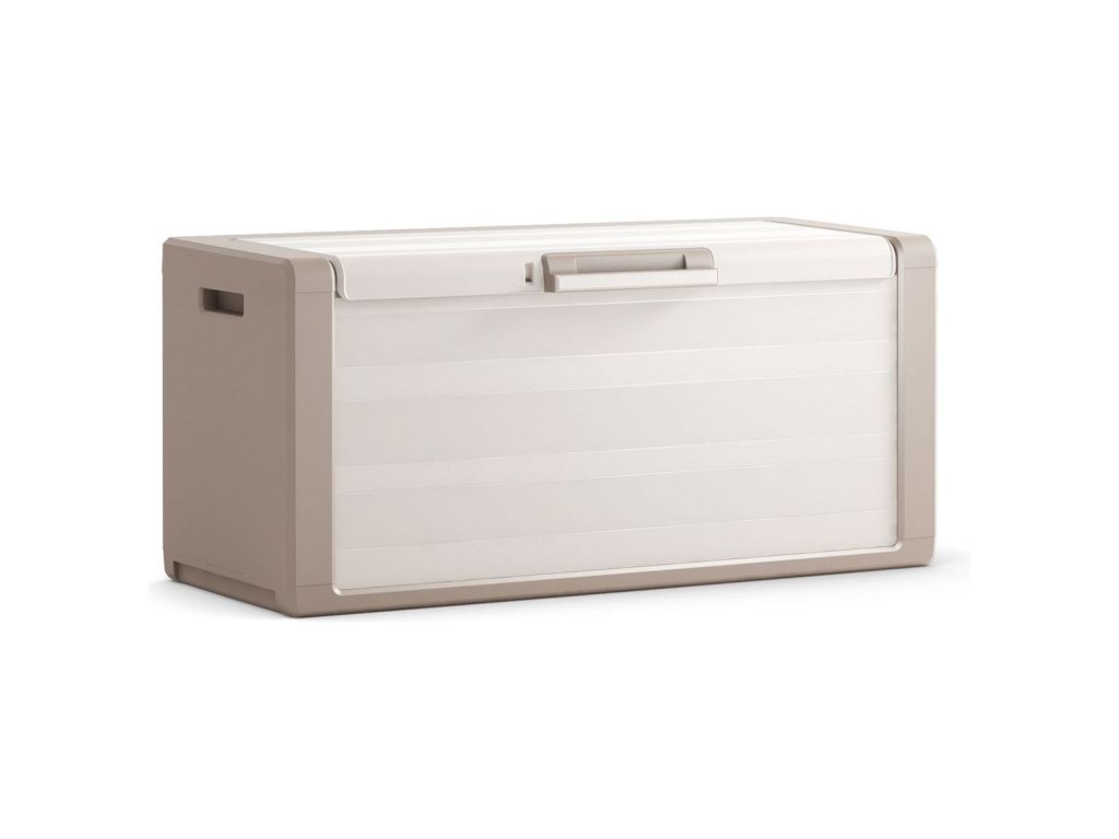 Úložný box s objemem 300 litrů, možnost dodatečného uzamčení, vyroben z propylenu velmi odolného proti chladu a nepříznivému počasí, olejům a rozpouštědlům, zvýšená odolnost proti nárazům, navíc je voděodolný, ideální do sklepa, garáže, dílny, na balkon, terasu či do chodby, rozměry boxu 118 x 49 x 55 cm, béžová/bílá