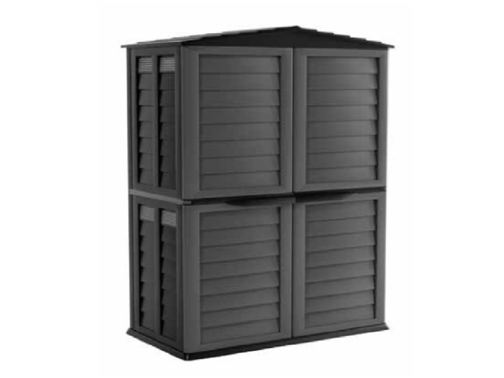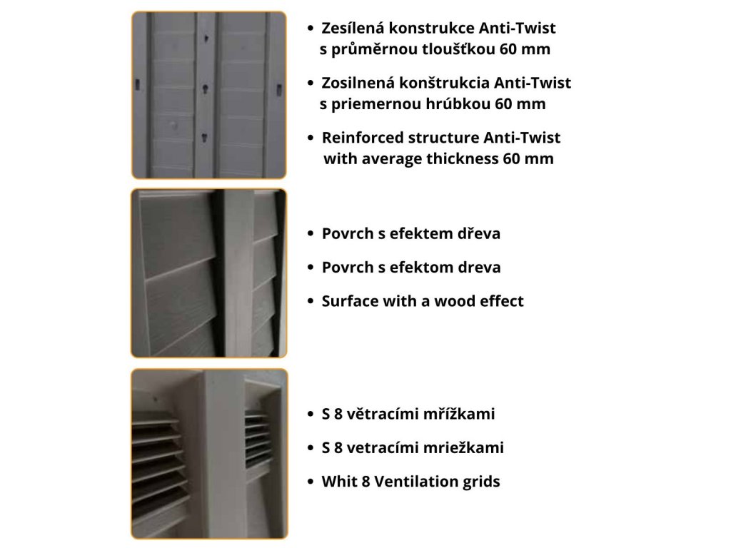 Specifikace: * vyrobené ze 100% regenerovaného polypropylenu * odolné proti UV záření a proti infiltraci * dvoukřídlé dveře * povrch s efektem dřeva * 8 větracích mřížek * omyvatelný materiál